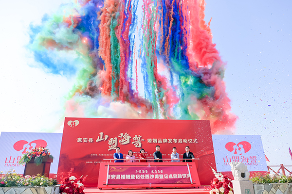 婚姻登记处西沙湾户外颁证点和“山盟海誓·爱在惠安”婚姻登记服务品牌,同时为20对新人颁发了结婚证。