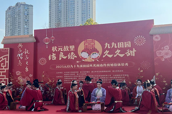 当天,“状元故里结良缘 九九田园久久甜”――2025元旦九十九溪田园风光闽南传统婚俗体验秀也在晋江市池店镇田洋村田洋九九精彩上演。新婚佳偶身着华丽的传统婚服,按照闽南传统婚礼习俗,举行了传统的婚礼大典,“倒毡礼、同牢礼、合卺礼、结发礼、执手礼”等仪式礼节都有着独特的寓意,充分展示了中国传统婚庆、闽南婚俗文化的独特魅力。